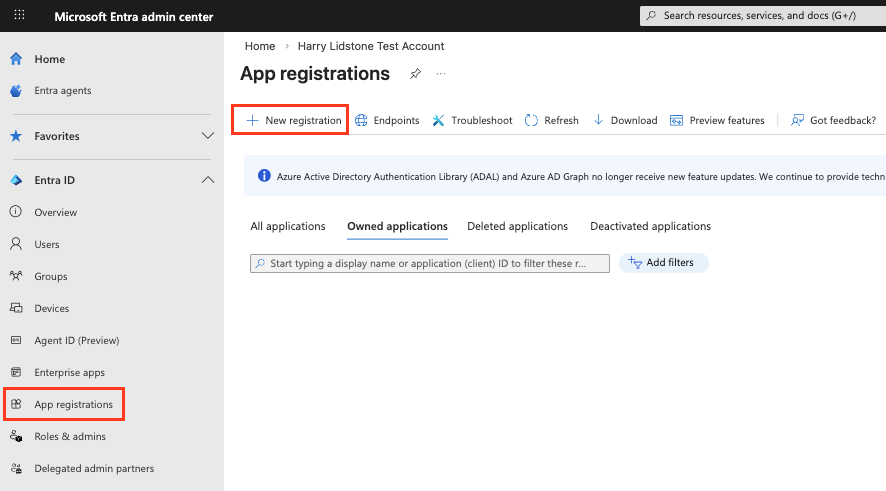 - Using the left hand navigation, click on App Registrations > New Registration